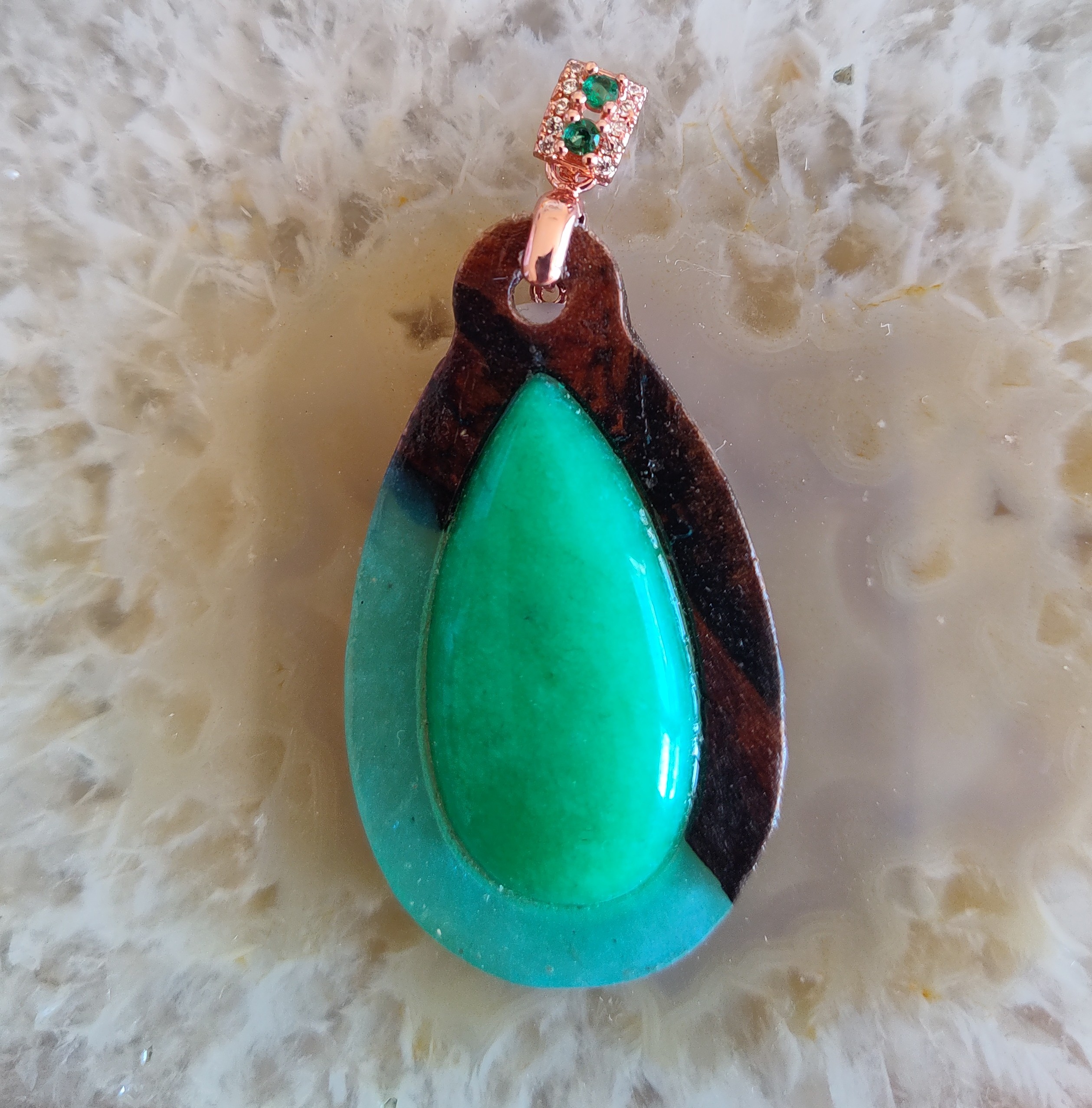 This stunning pendant is a perfect blend of natural beauty and artistic craftsmanship! Made from pecan wood, it features a mesmerizing jade stone at its center, surrounded by shimmering green mica powder resin. The rich, warm tones of the pecan wood beautifully complement the vibrant green hues of the jade stone and resin, creating a unique and eye-catching accessory. This piece is not just jewelry; it's a testament to the beauty and versatility of pecan wood and the enchanting allure of jade and mica powder resin.