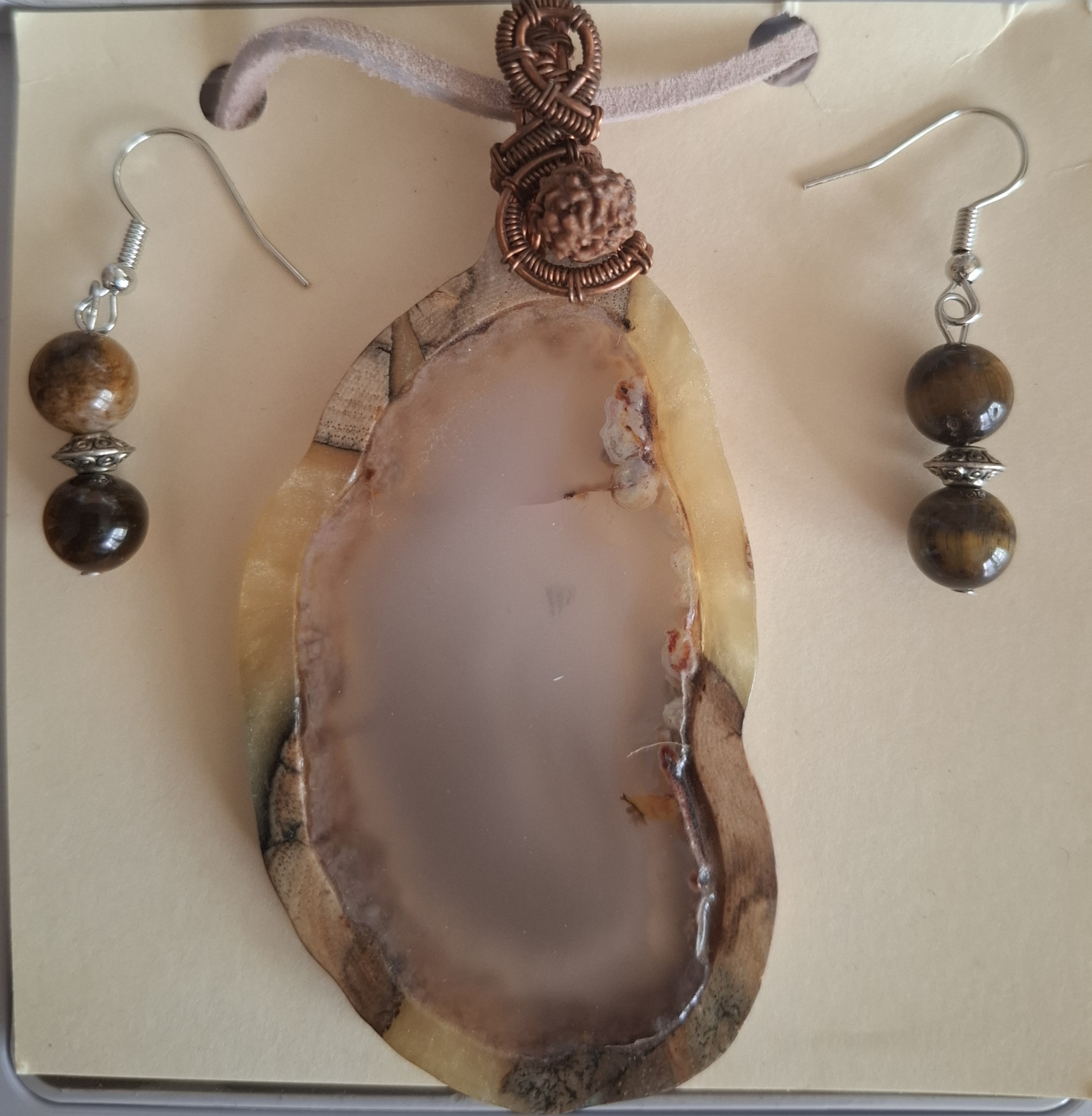 This stunning jewelry set is a perfect blend of natural beauty and artistic craftsmanship! The pendant features a mesmerizing agate inlay encased in pecan wood, showcasing the intricate patterns and rich colors of the stone. The matching earrings are adorned with delicate tiger eye gemstone beads, adding a touch of elegance and sophistication. This set is a wearable piece of art that will add a touch of nature-inspired charm and luxury to any outfit.